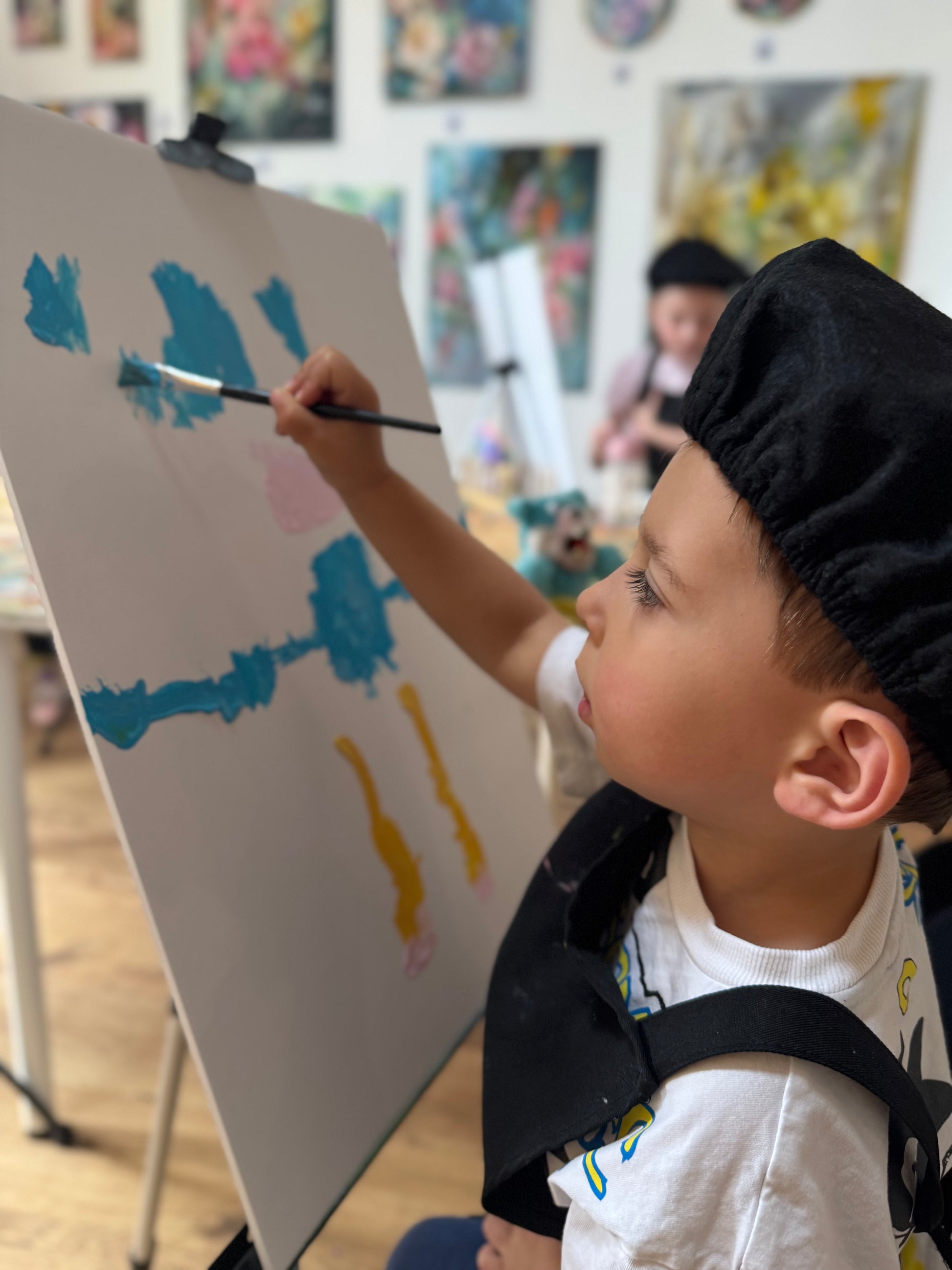 Each child has their own art set up, with paints, easel , table space, artist beret and apron and traditional wooden paint pallet.
