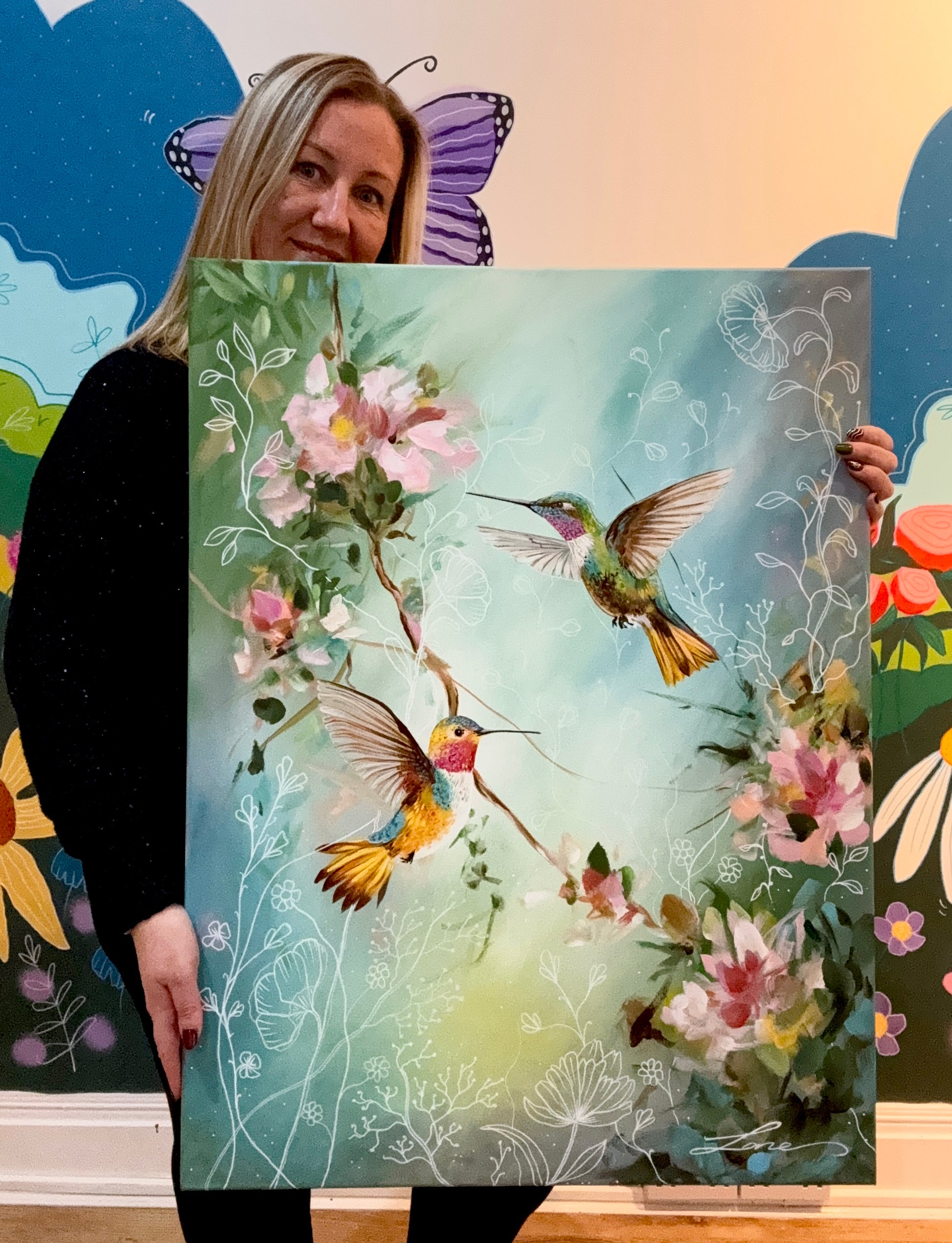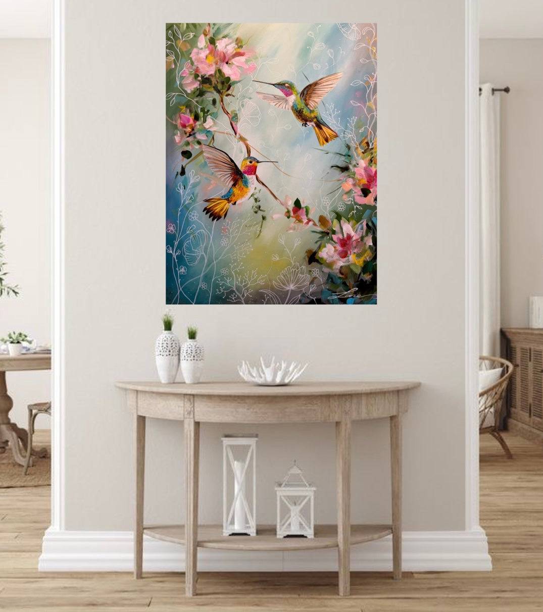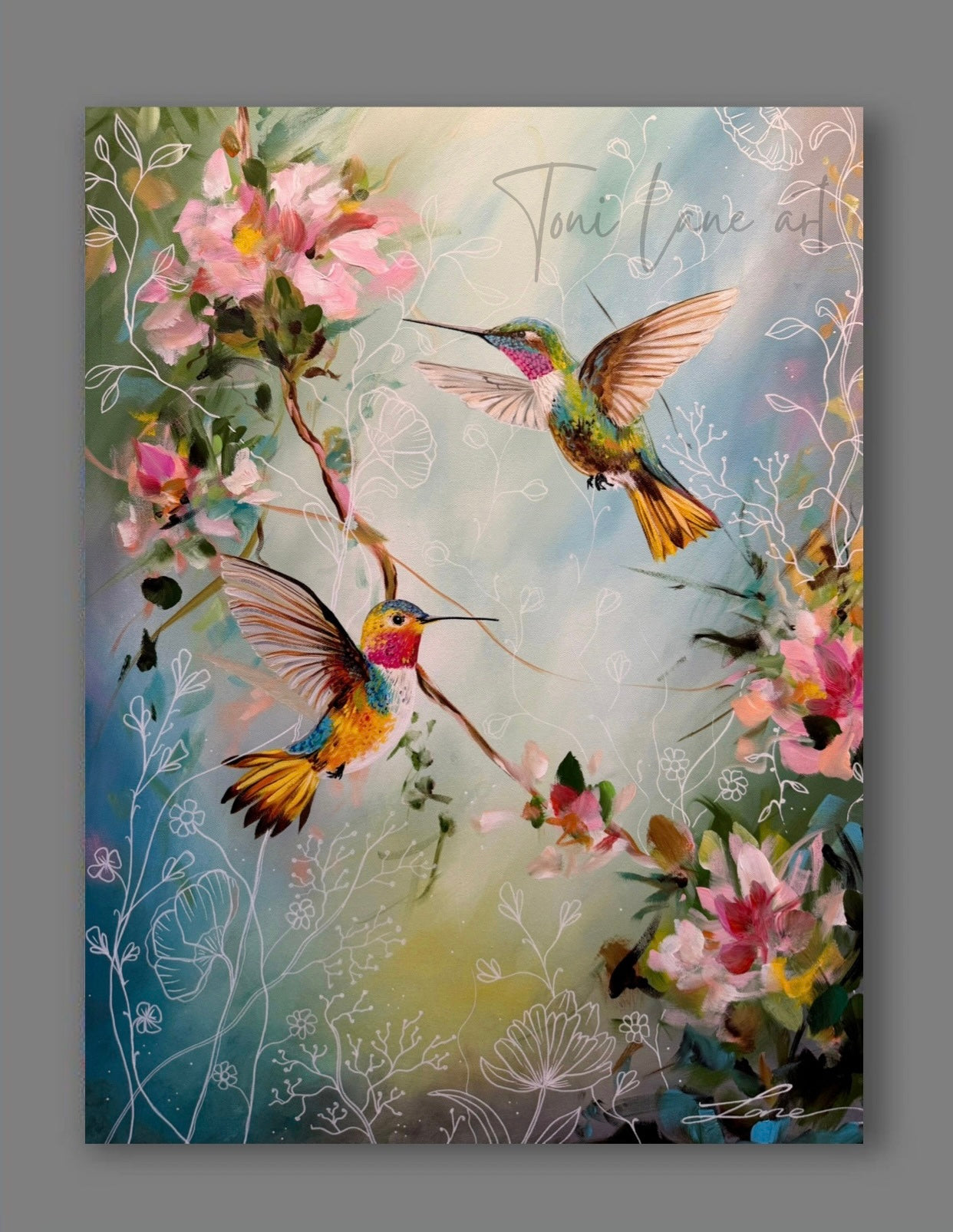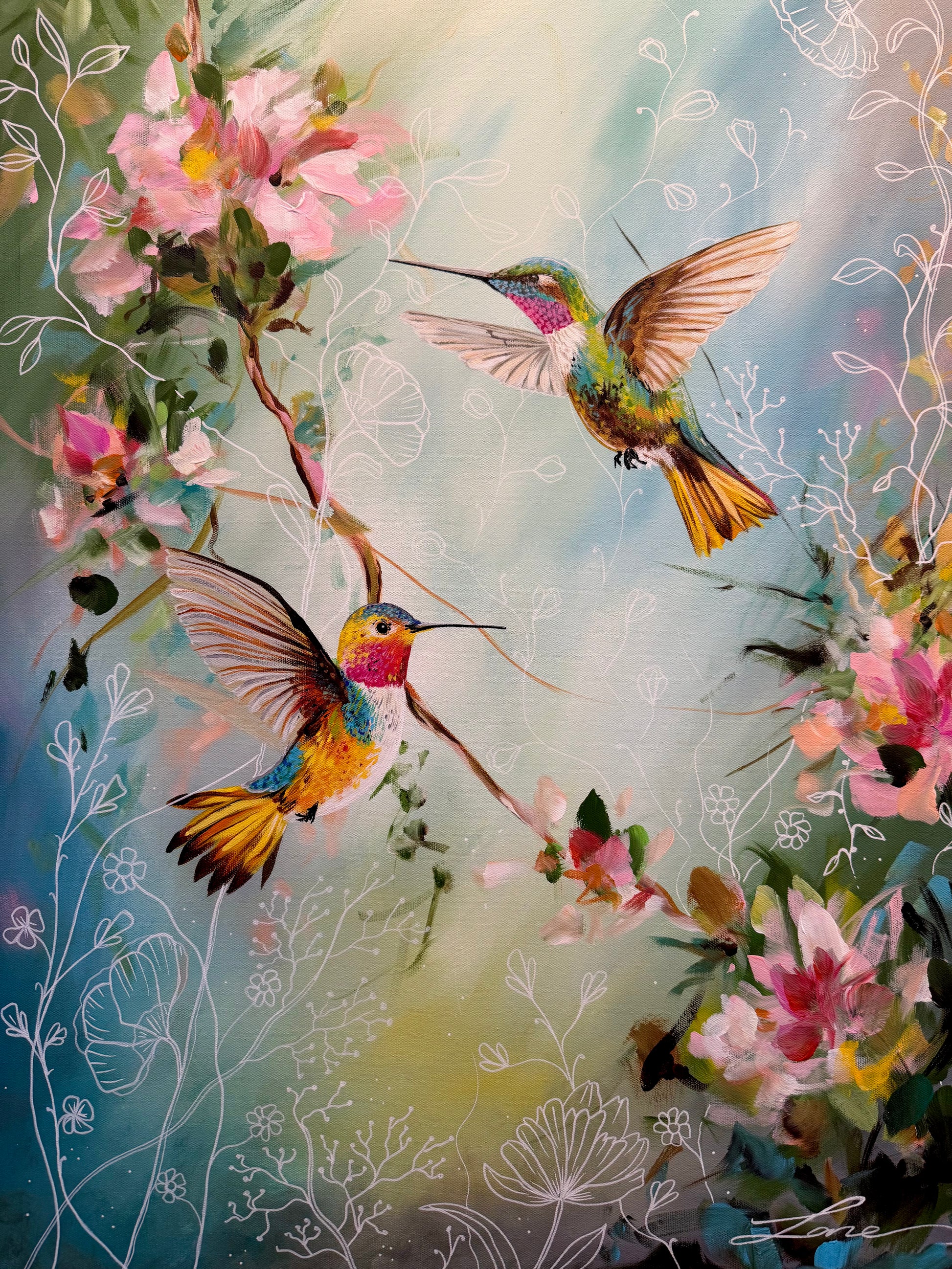 Capture the delicate dance of nature with this enchanting original hummingbird painting. Two graceful hummingbirds hover amongst hand-drawn flowers set against a soft green background, creating an atmosphere of pure lightness and wonder. Abstract floral elements add artistic flair, blending realism with imaginative flourishes. Each brushstroke celebrates the beauty of these tiny jewels in motion, making "Light of Day" a perfect addition for anyone who adores wildlife art with a whimsical twist.