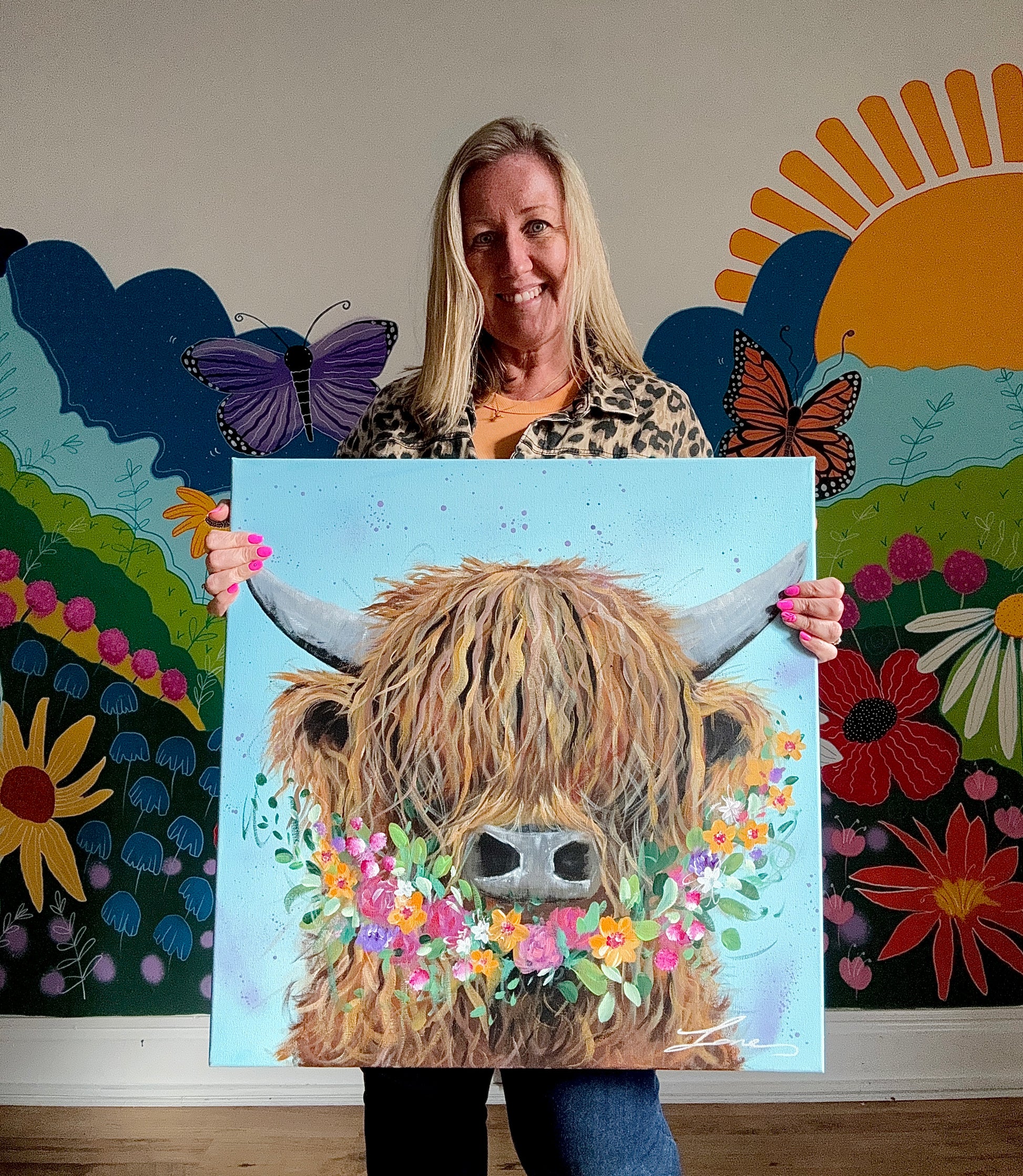 “Milking it” is an original painting full of charm and character, featuring a lovable highland cow against a bright blue backdrop. This playful piece adds a splash of fun and countryside whimsy to any room, making it a perfect choice for those who enjoy quirky, eye-catching art with a touch of personality.