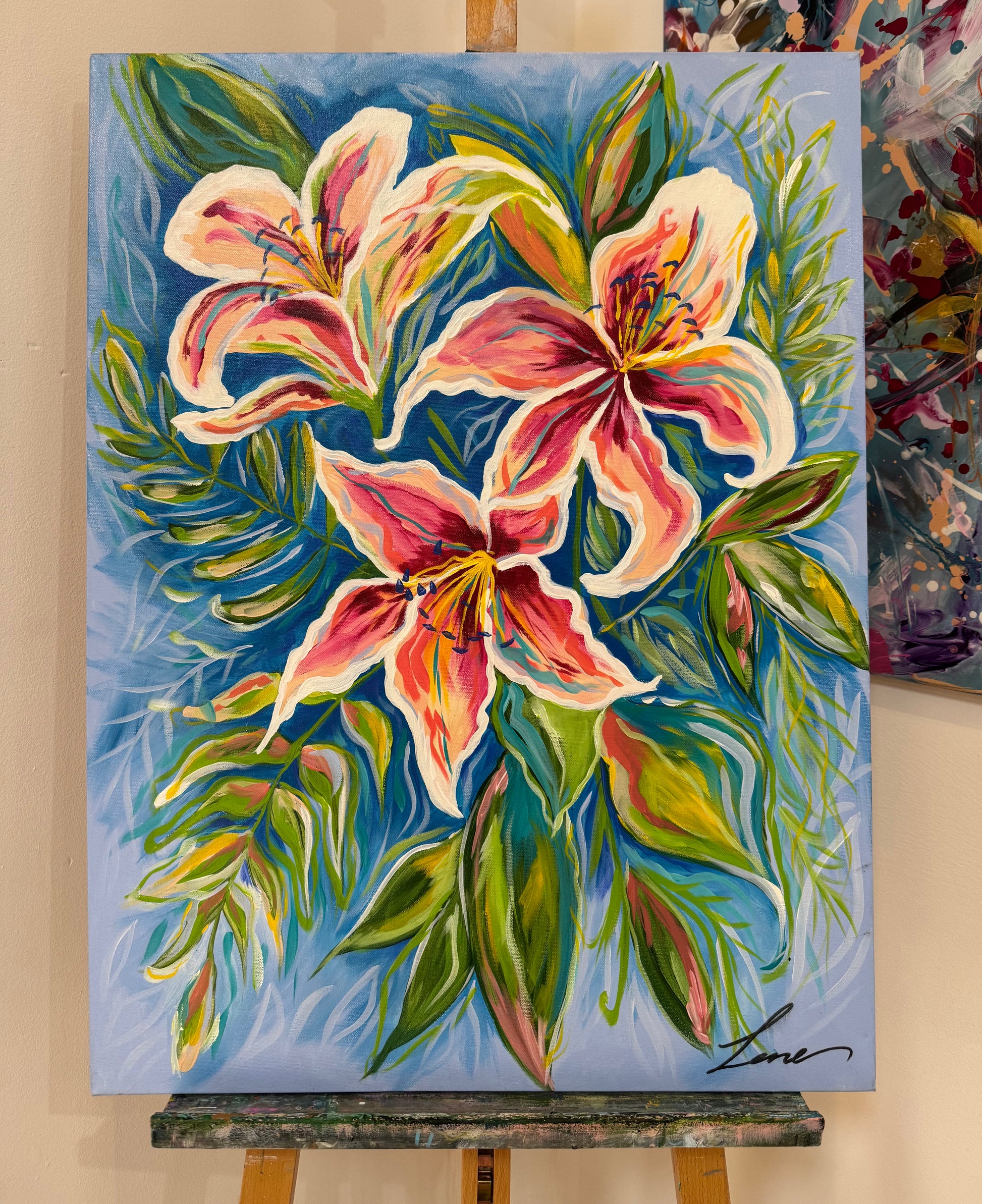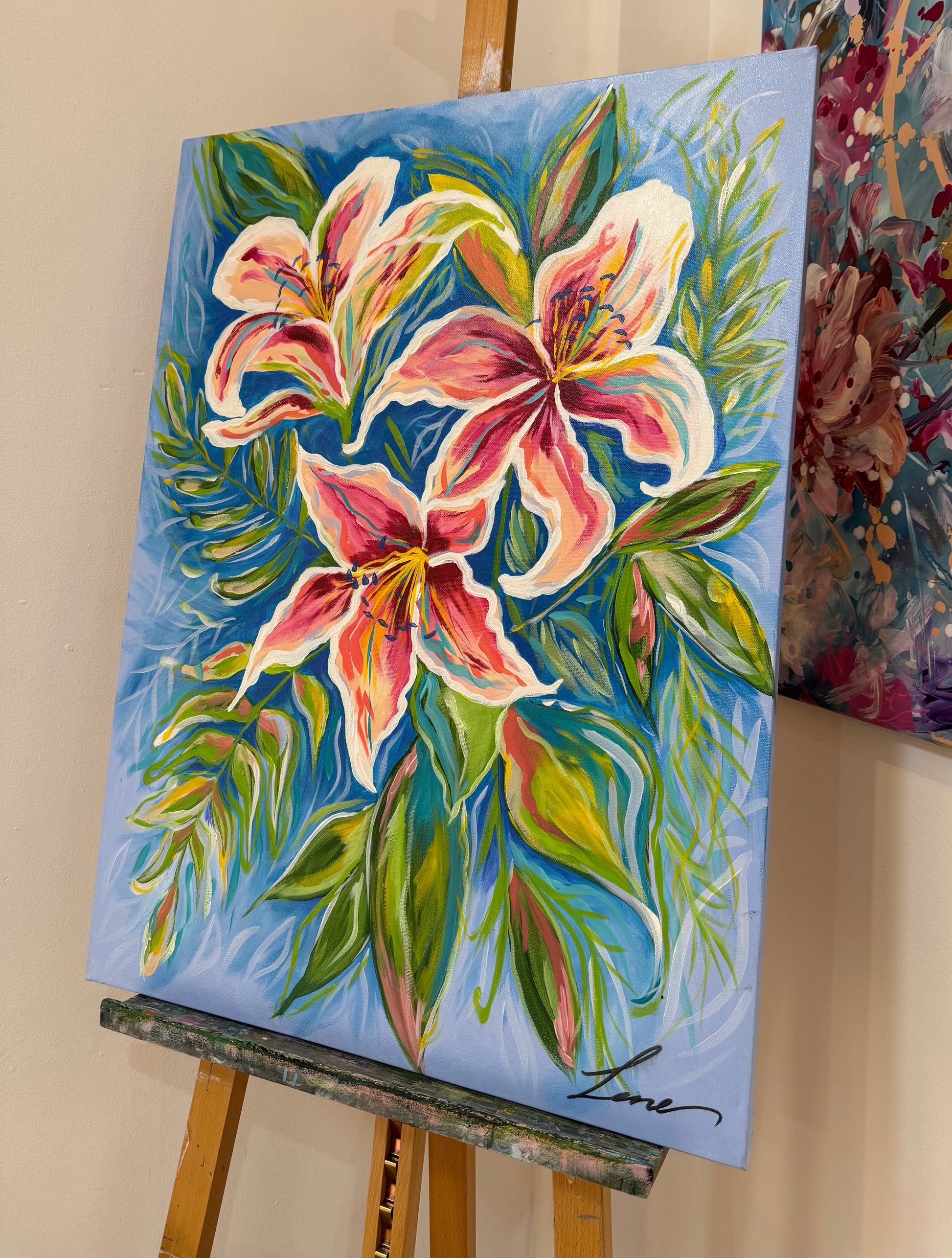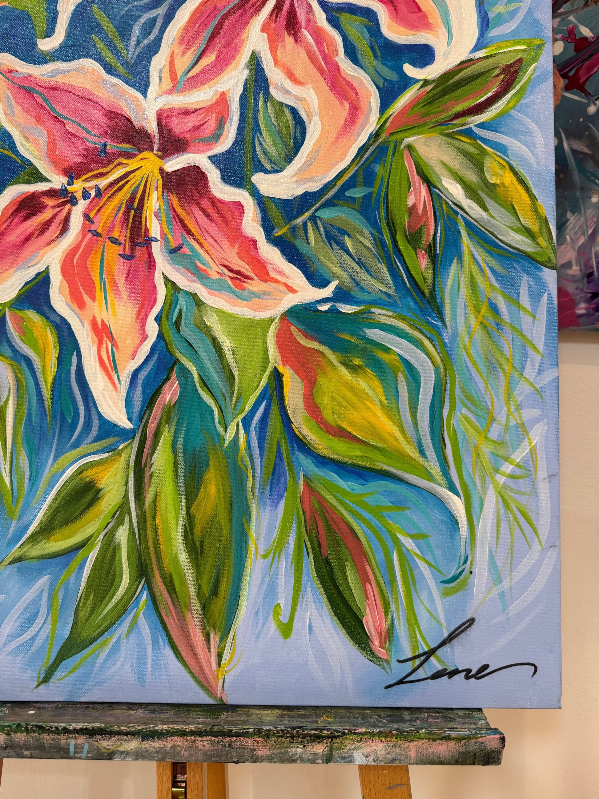 Transform your space with "Paradise," an original painting that effortlessly blends serene blue hues with striking pink and white lilies. This captivating artwork not only brings a burst of color but also creates a calming ambiance that uplifts any room. Perfect for those who value both beauty and tranquility.